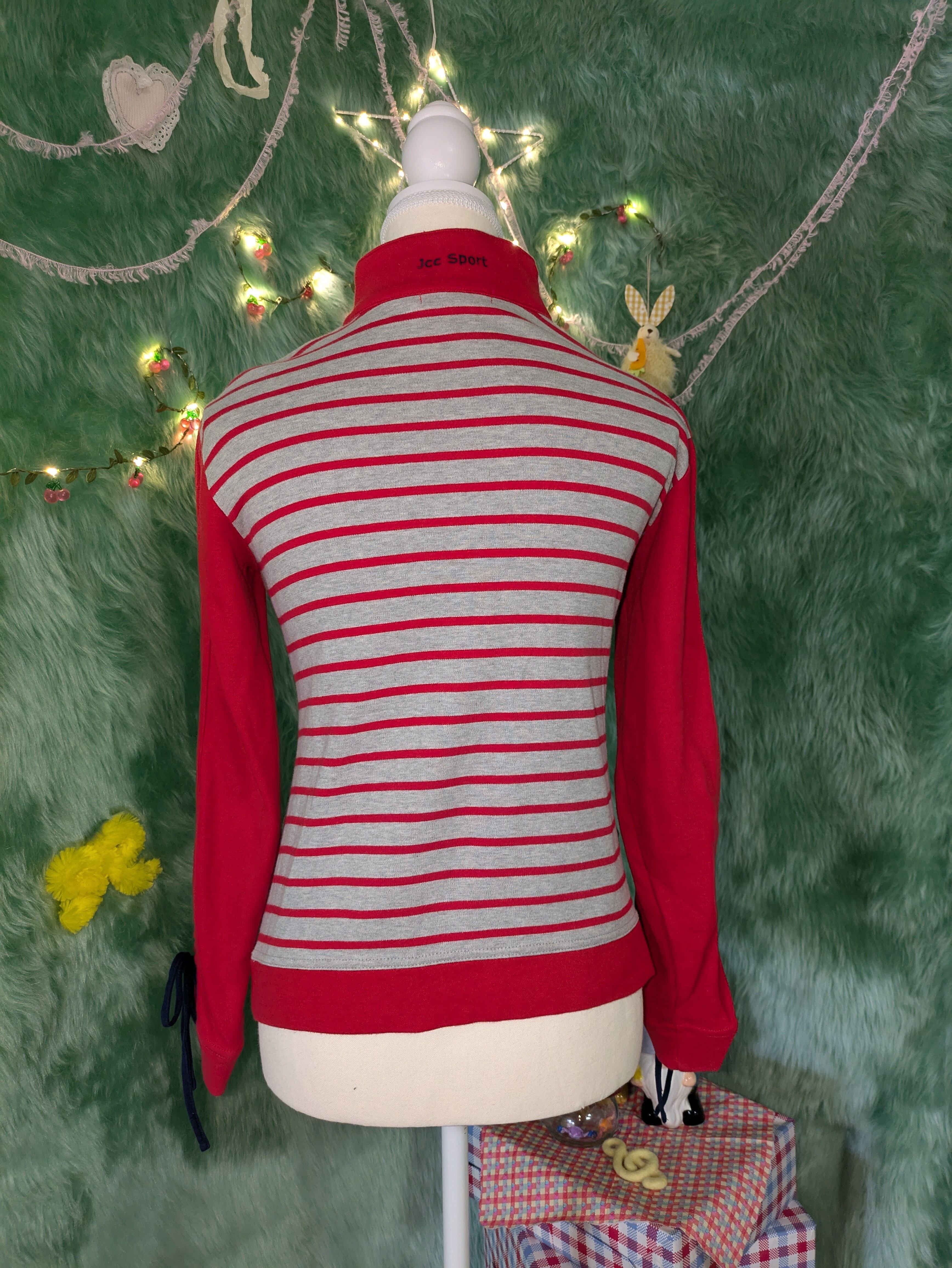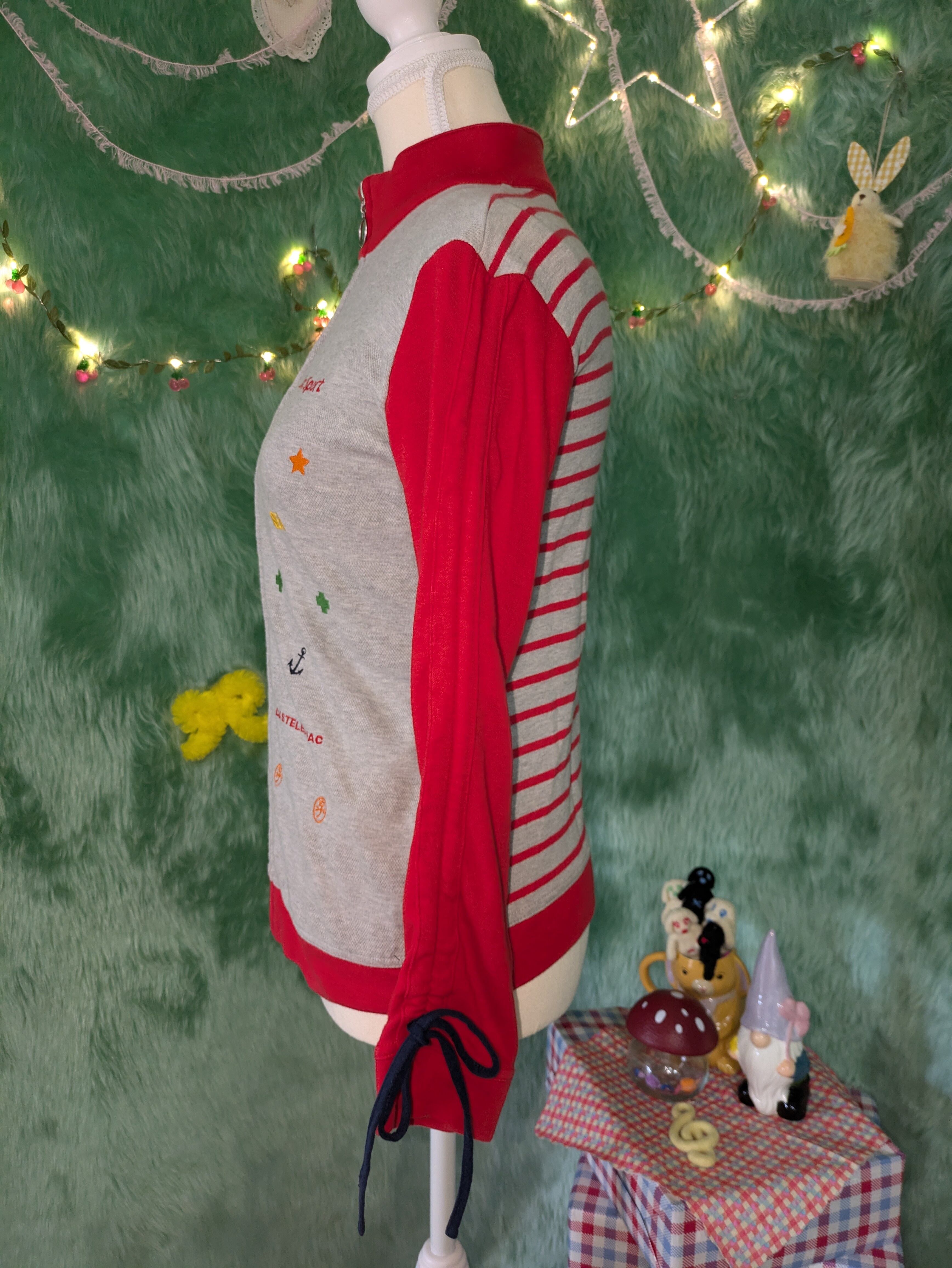 シンプルなトラックジャケットの形に、袖のドローストリングリボン、前面の刺繍、背面にはボーダーと、可愛いがたくさん散りばめられた1点です❣️