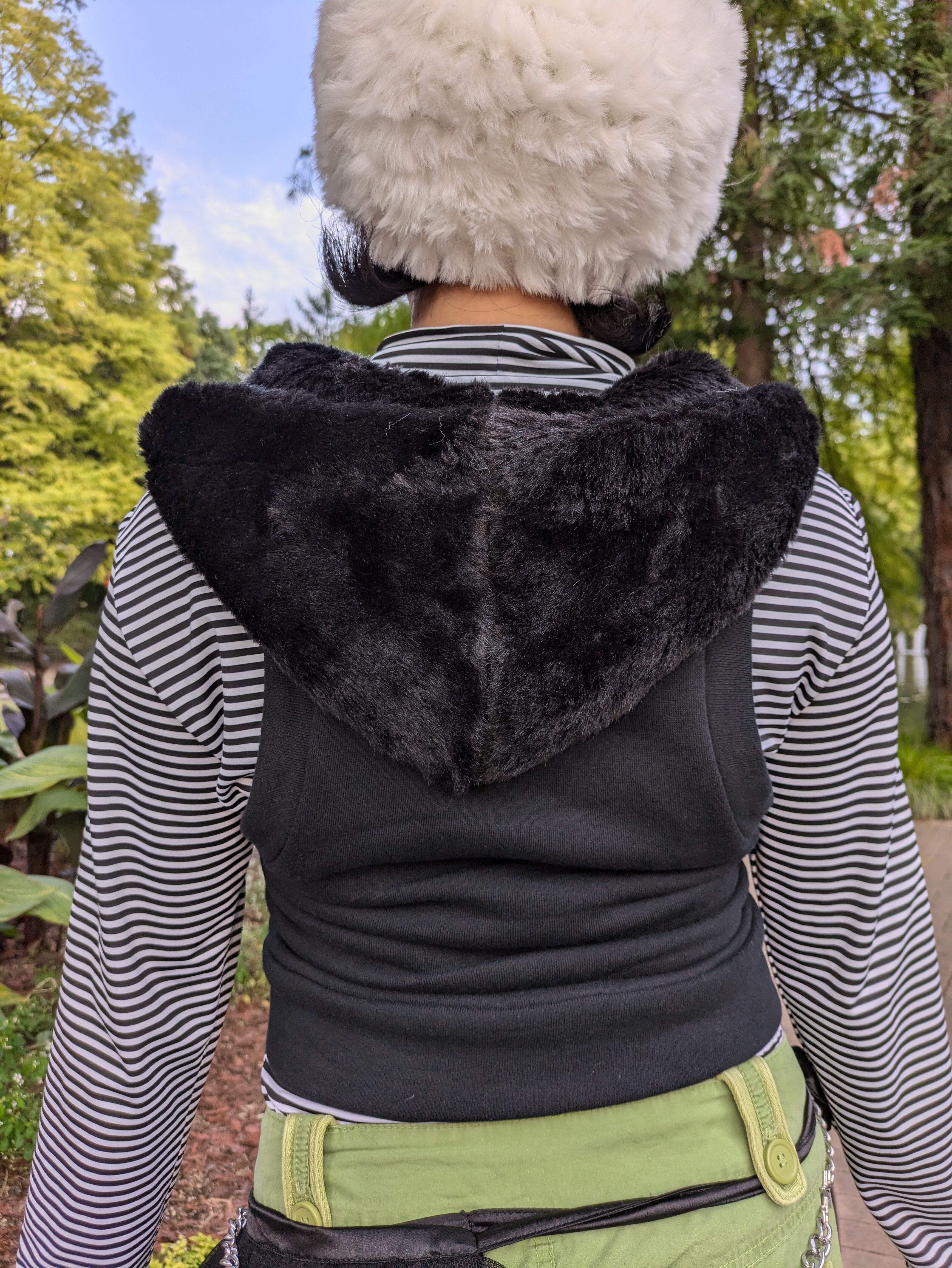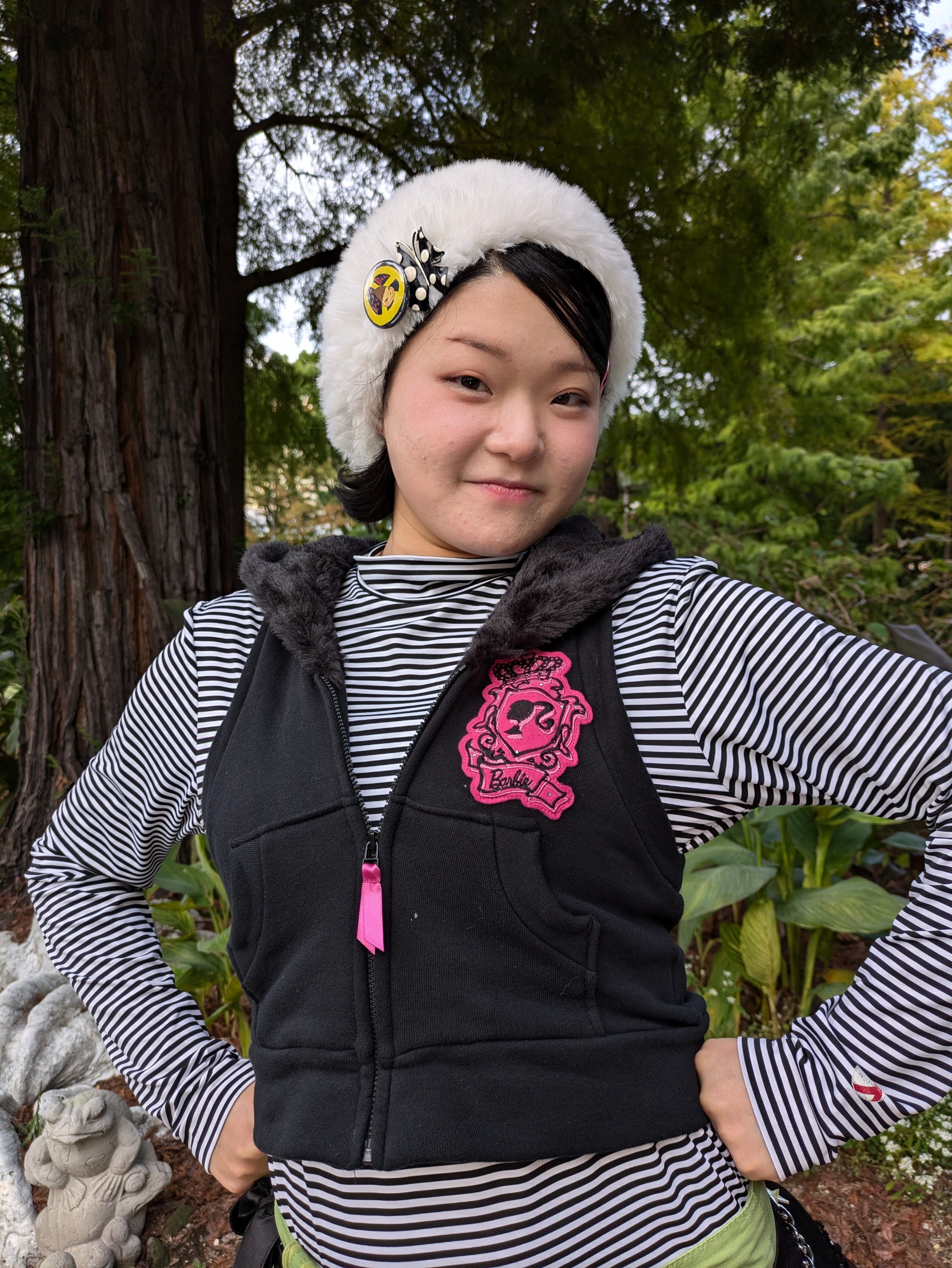 Barbieのワッペンとモコモコファーのフードがプリティーなジップアップベストです︎♡ボリュームたっぷりのフードとアメリカンスリーブのようなシルエットが魅力的なので、これ1点取り入れるだけでとっても目を引くコーディネートに!