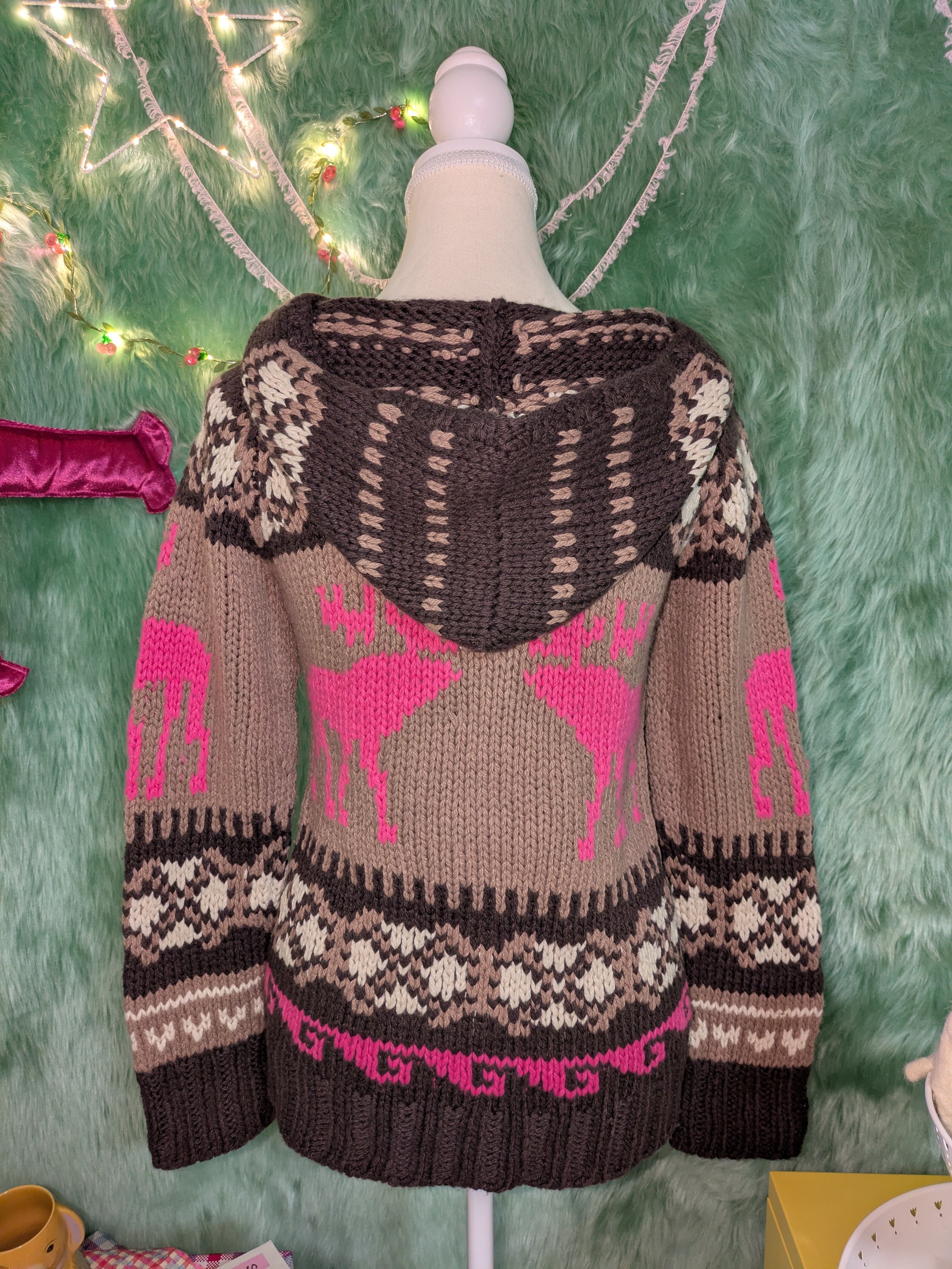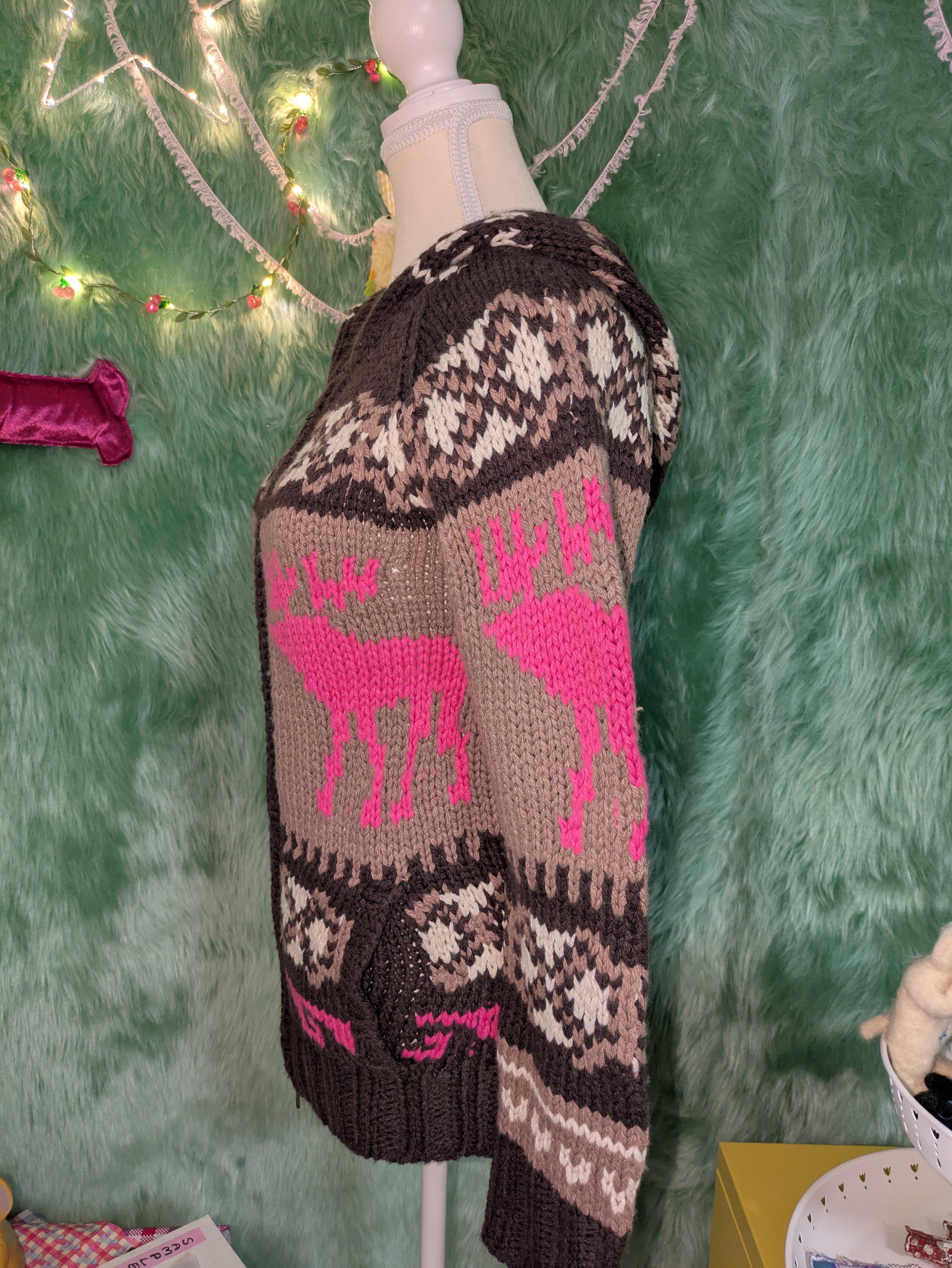 【USED】ノルディック柄ピンクジップアップニットフーディ❆