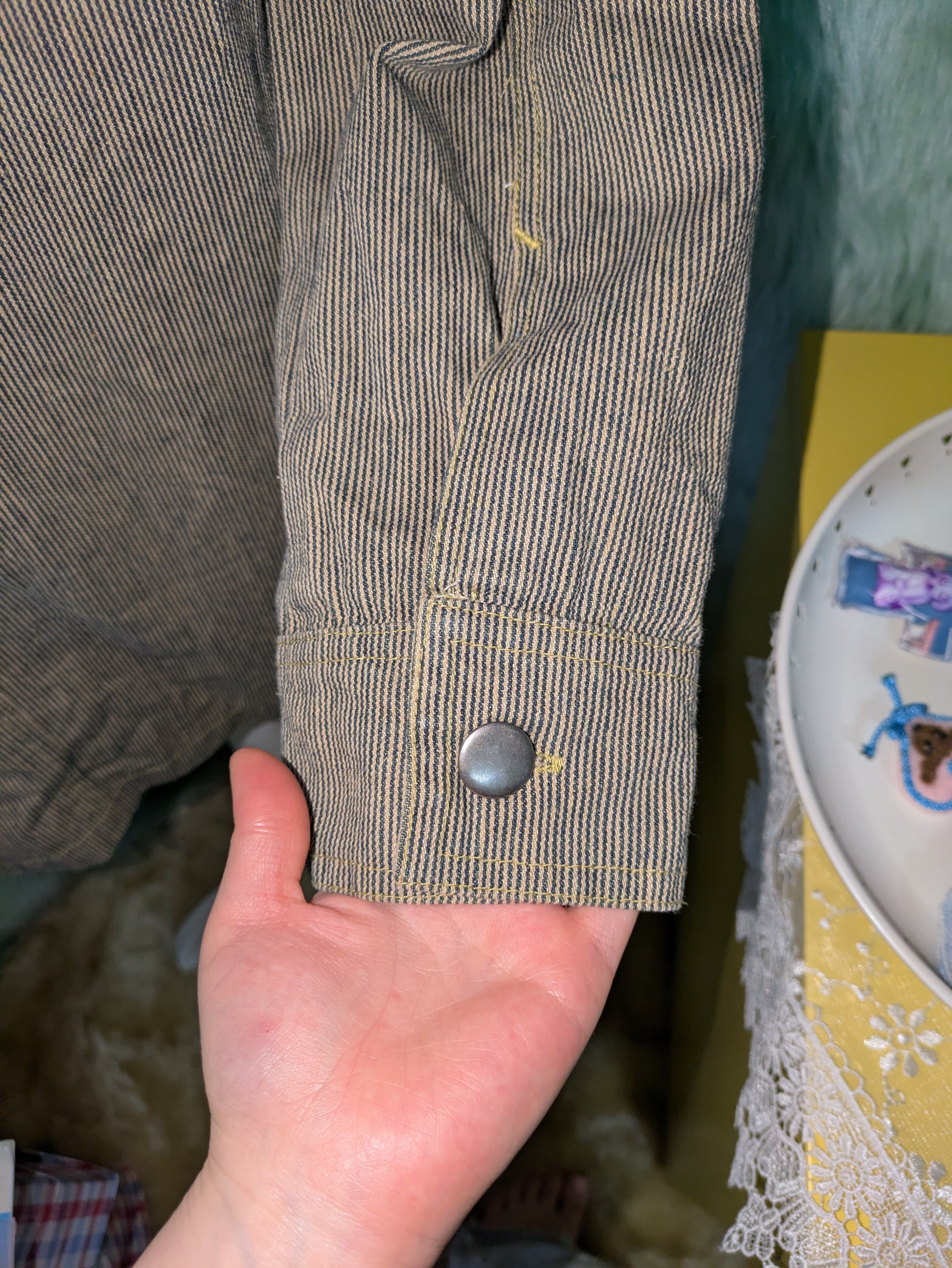 細かなストライプが印象的なヒッコリー素材で、デニムに近いしっかりとした風合いです★
