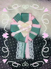 リボンとハートがかわいいロゼットブローチです⋆˚ʚɞ ロマンチックなカラーリングと模様でお出かけをよりハッピーに( ^> ̫ < )b⟡.· サイズ:縦13cm×横8.5cm